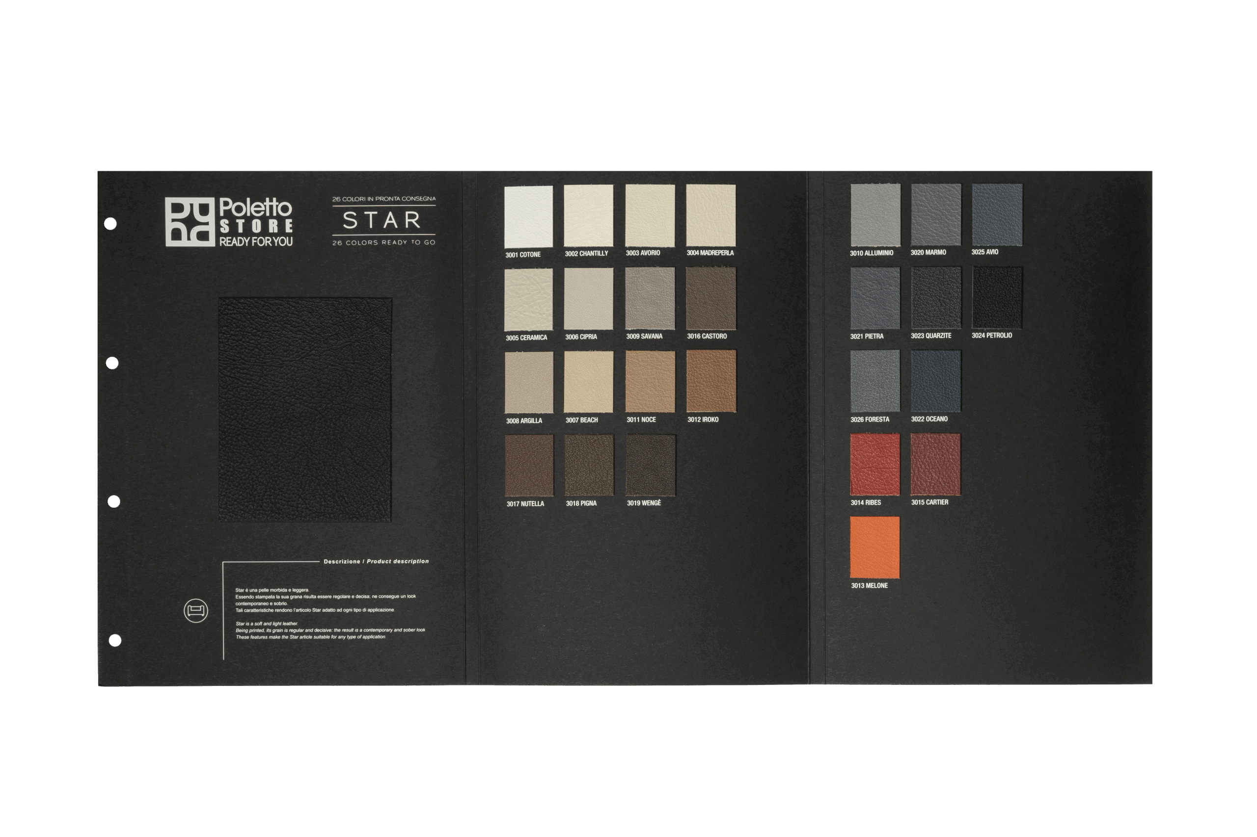 It's a soft and light leather. Being printed, its grain is regular and decisive, the result is a contemporary and sober look.